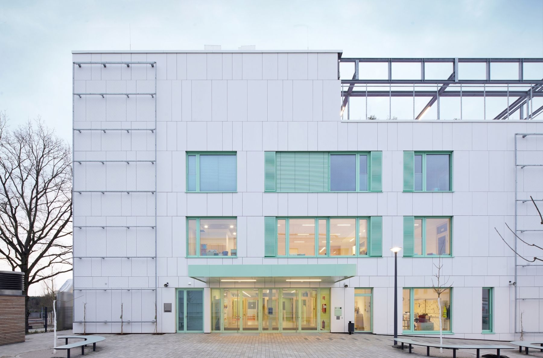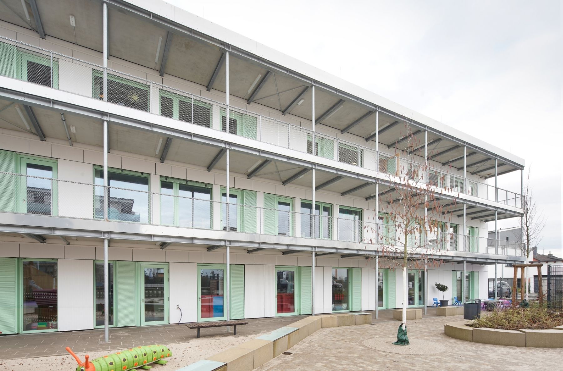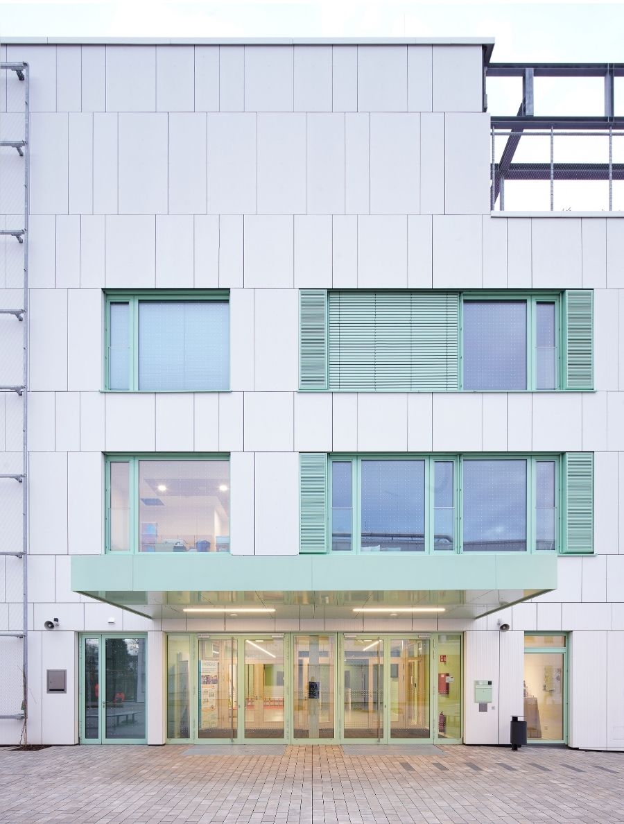 Der dreigeschossige Baukörper der Kita folgt einem stringenten, funktionalen Raster mit zentralem Erschließungsflur. An der Westfassade liegt ein vorgelagerter Laubengang als Flucht- und Zugangsebene in einer filigranen Pfosten-Riegel-Konstruktion aus Stahl – ein bewusstes konstruktives Gegengewicht zur Massivität der Hauptstruktur. Beide Gebäude sind mit begrünten Dachflächen versehen, teilweise auch mit begrünten Fassadenanteilen.