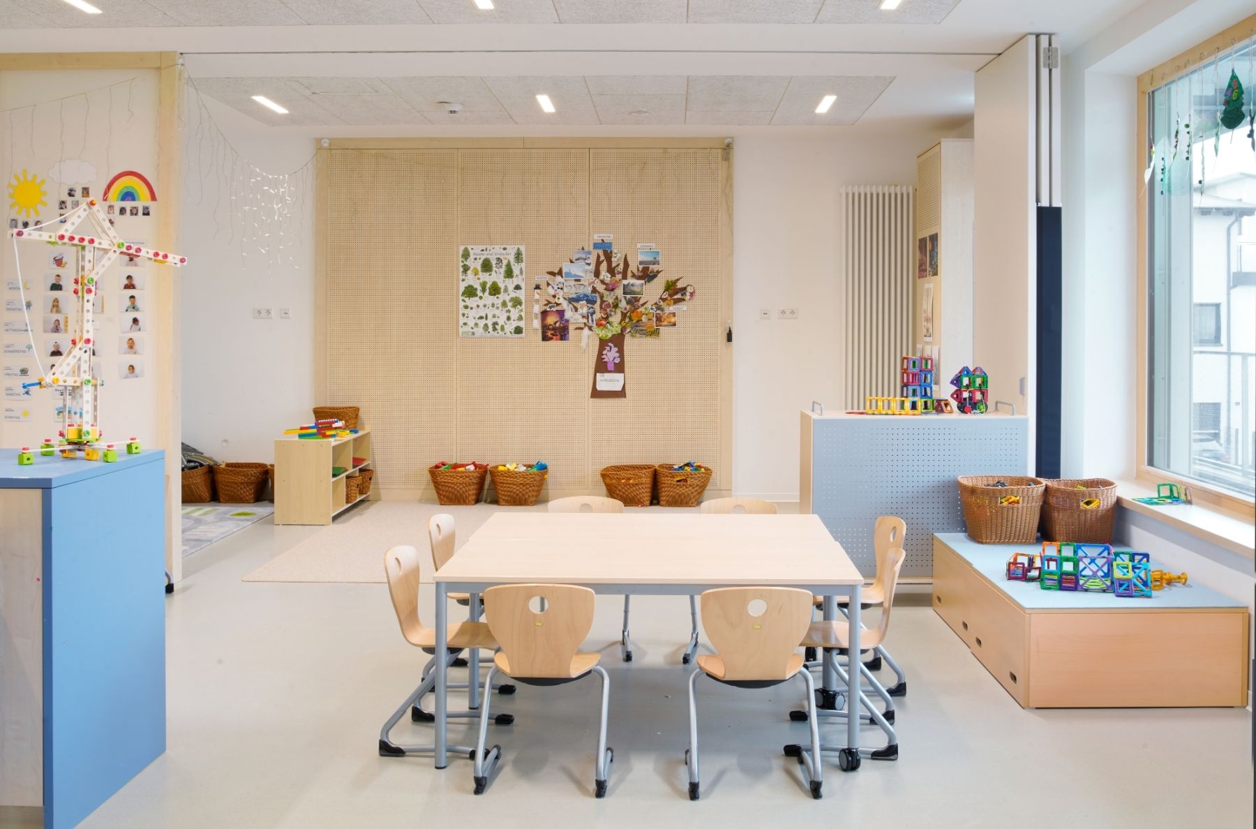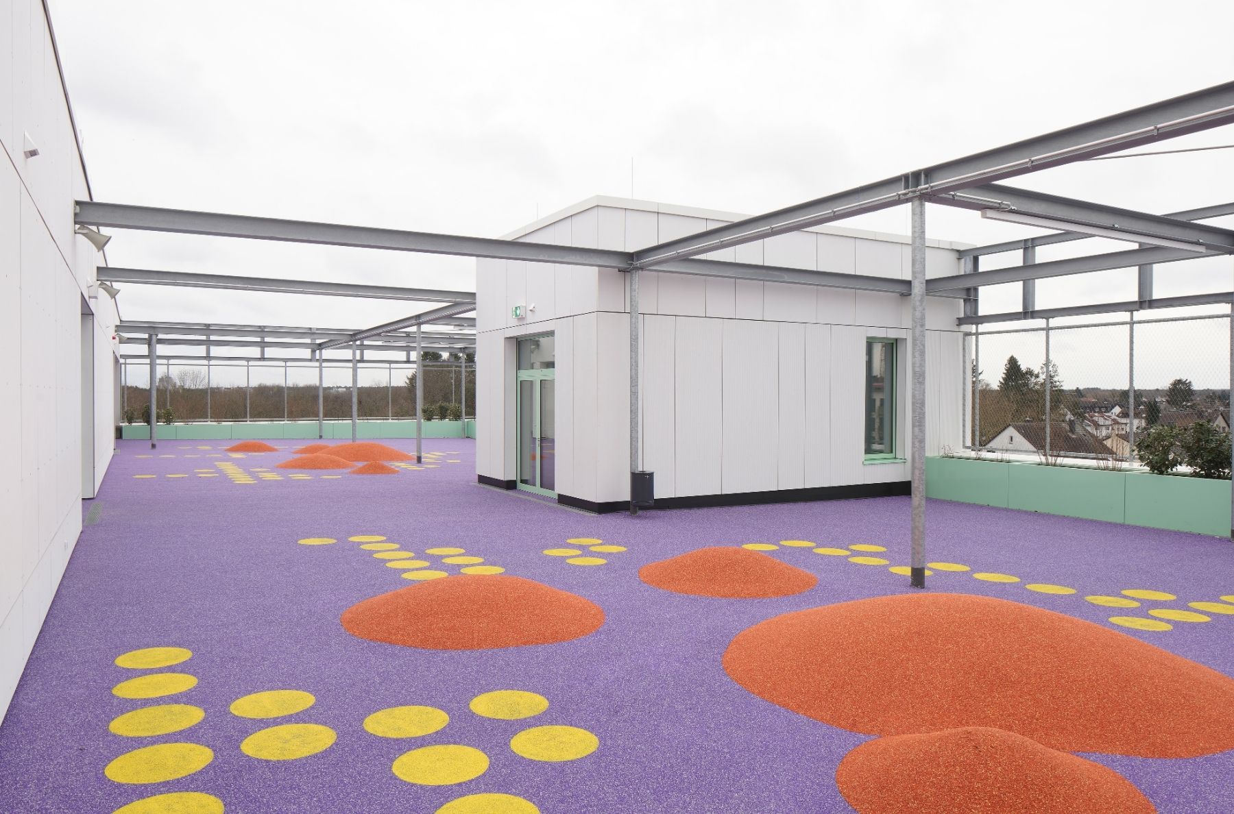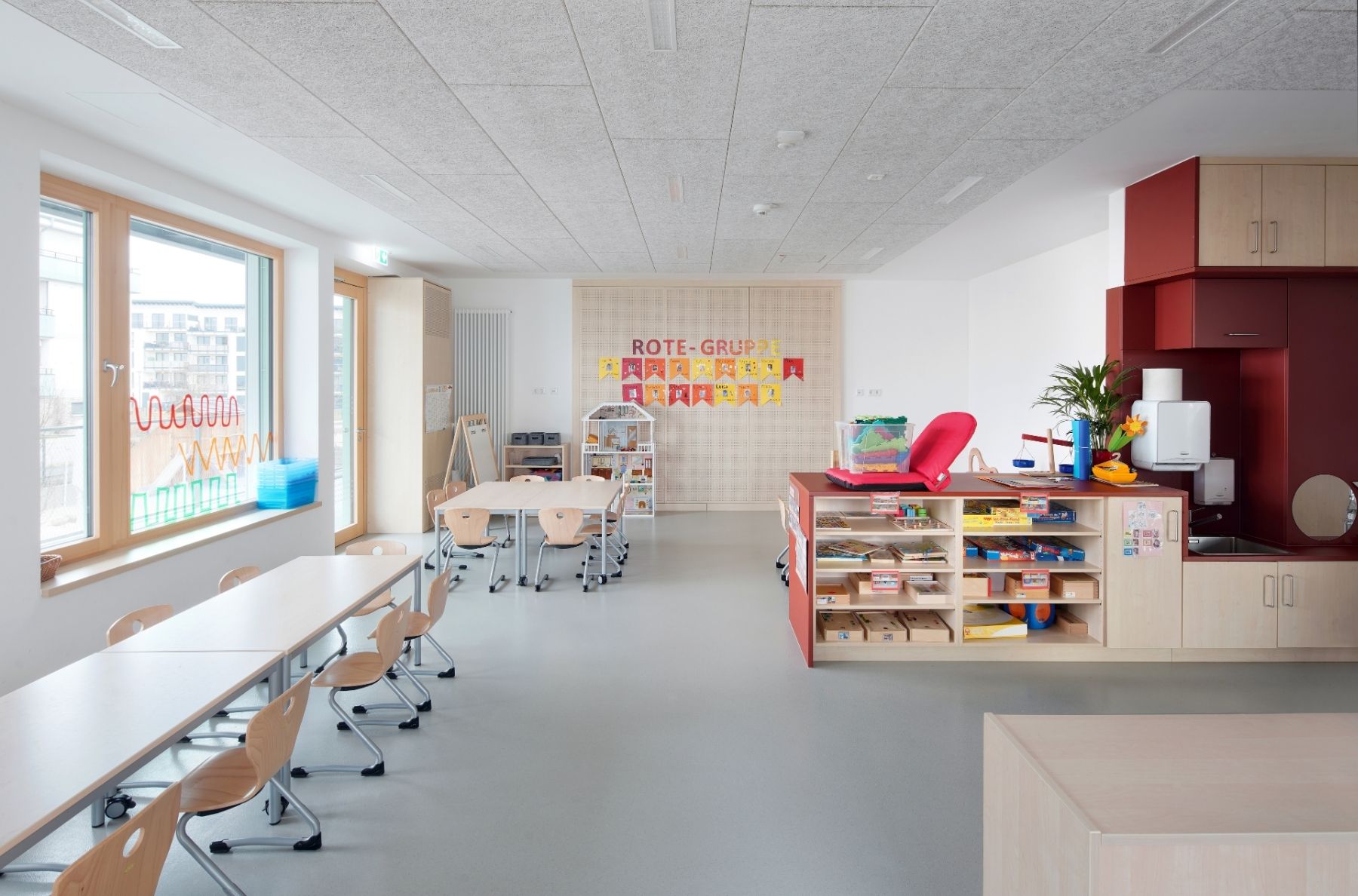 Der dreigeschossige Baukörper der Kita folgt einem stringenten, funktionalen Raster mit zentralem Erschließungsflur. An der Westfassade liegt ein vorgelagerter Laubengang als Flucht- und Zugangsebene in einer filigranen Pfosten-Riegel-Konstruktion aus Stahl – ein bewusstes konstruktives Gegengewicht zur Massivität der Hauptstruktur. Beide Gebäude sind mit begrünten Dachflächen versehen, teilweise auch mit begrünten Fassadenanteilen.