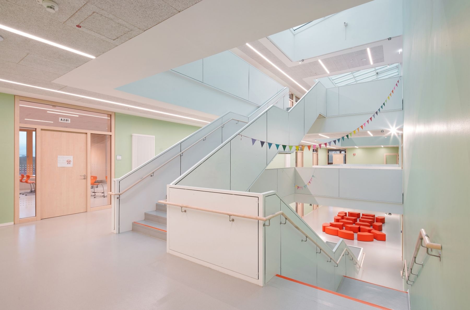 Das viergeschossige Schulgebäude mit wasserundurchlässigem Untergeschoss organisiert sich um eine zentrale Eingangshalle mit großzügiger Sitztreppe und durchgestecktem Luftraum bis ins dritte Obergeschoss. Herzstück des Tragwerks ist die Sporthalle, die mit einer Spannweite von 15,6 Metern nicht nur weite Deckenfelder überspannt, sondern über wandartige Träger und Verbundelemente Teile der aufliegenden Obergeschosse abfängt. Die drei Geschosse darüber sind konsequent in Lerncluster gegliedert und münden im dritten OG in eine teilüberdachte, als Schulhof genutzte Dachfläche. Die Cafeteria, Lehrer- und Bibliotheksräume sowie diverse Fach- und Nebenräume komplettieren das Raumprogramm.