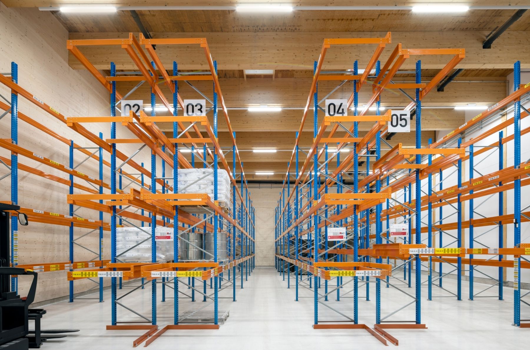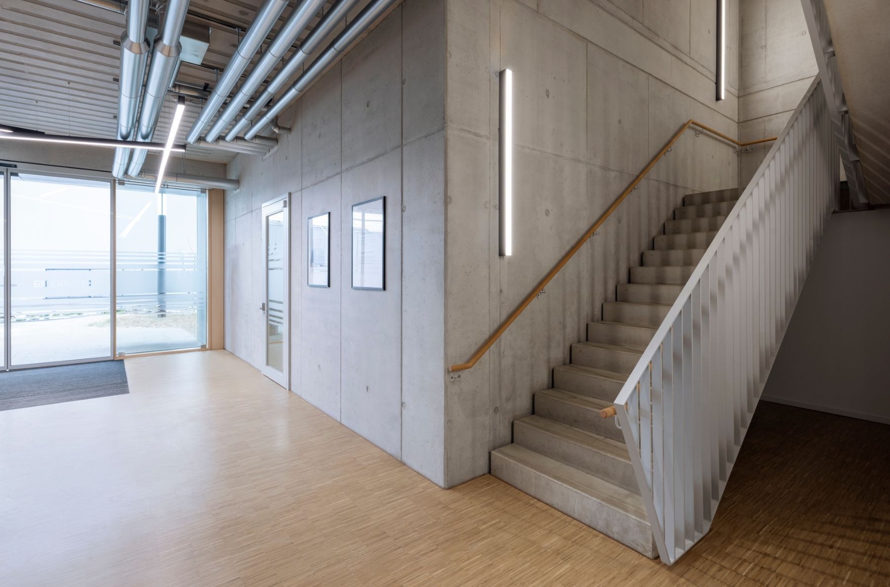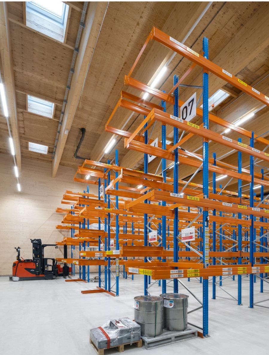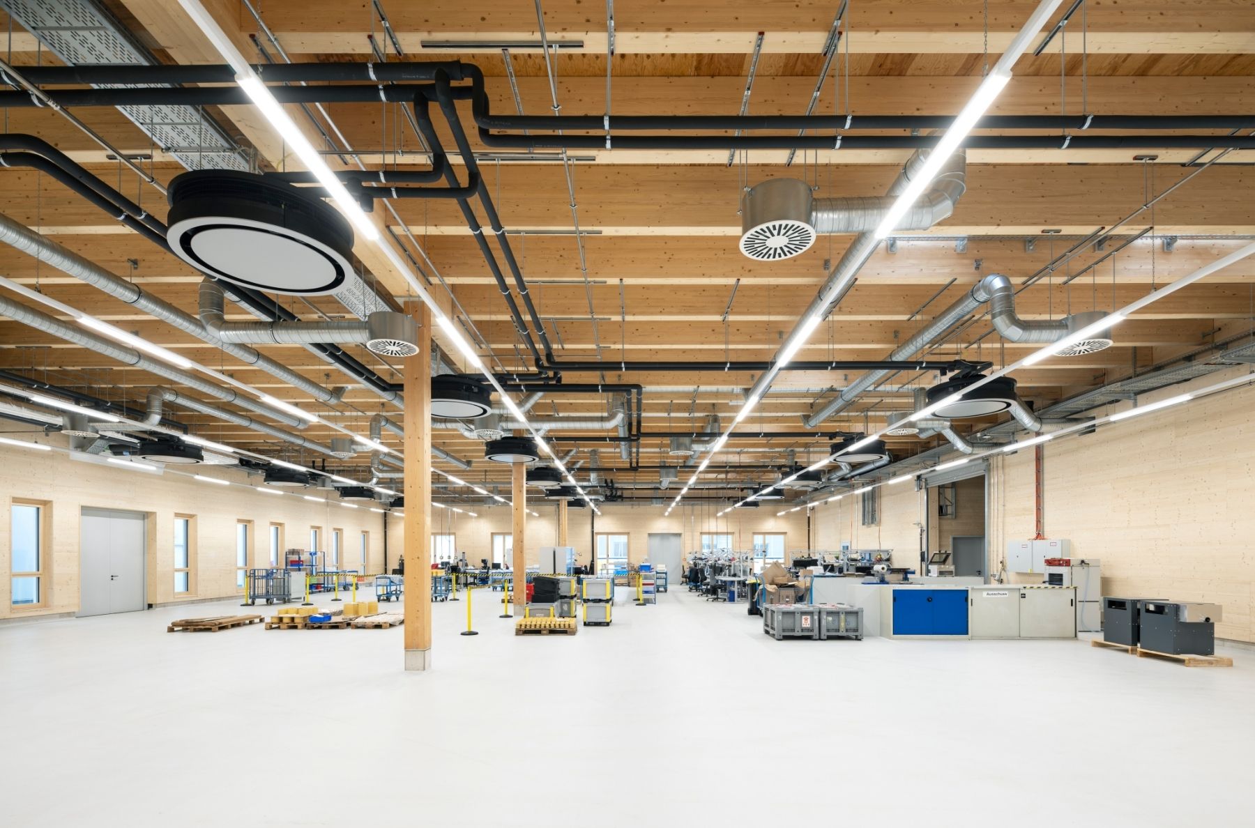 Im Erdgeschoss sorgt Stahlbeton für Robustheit bei hohen Lasten. Die drei oberen Geschosse sind als Holzbau konzipiert. Ergänzt wird das Ensemble durch ein Produktions- und Logistikgebäude in reiner Holzkonstruktion.