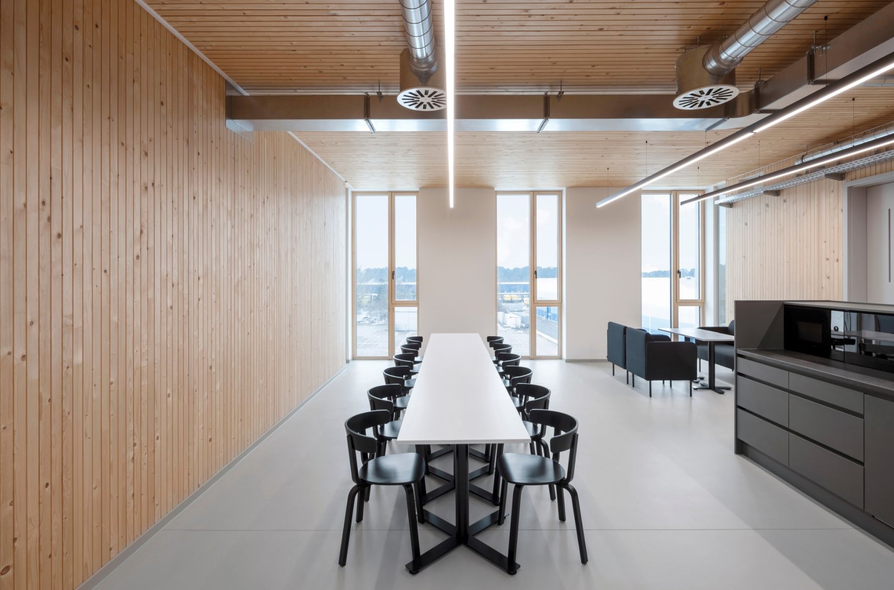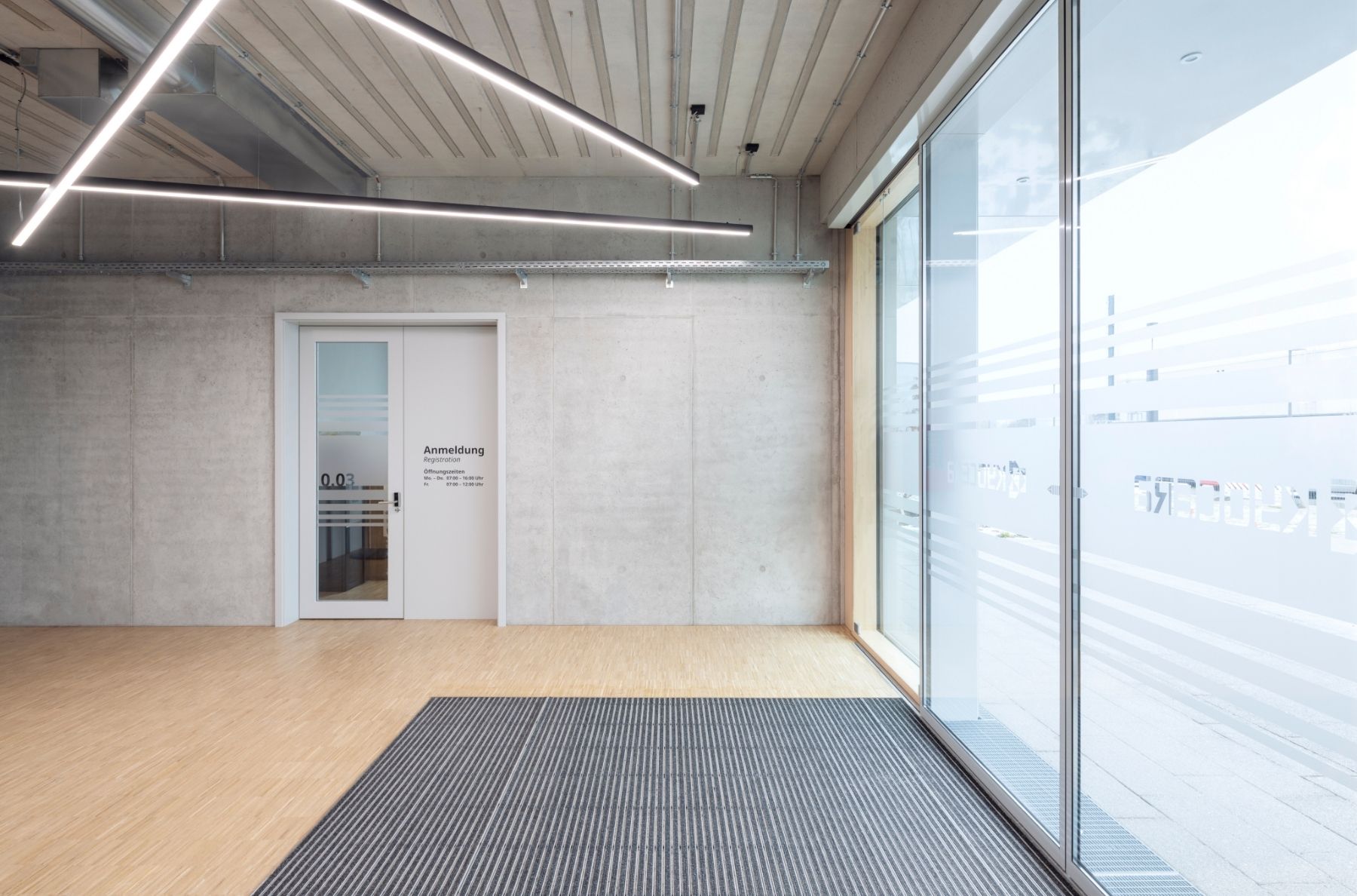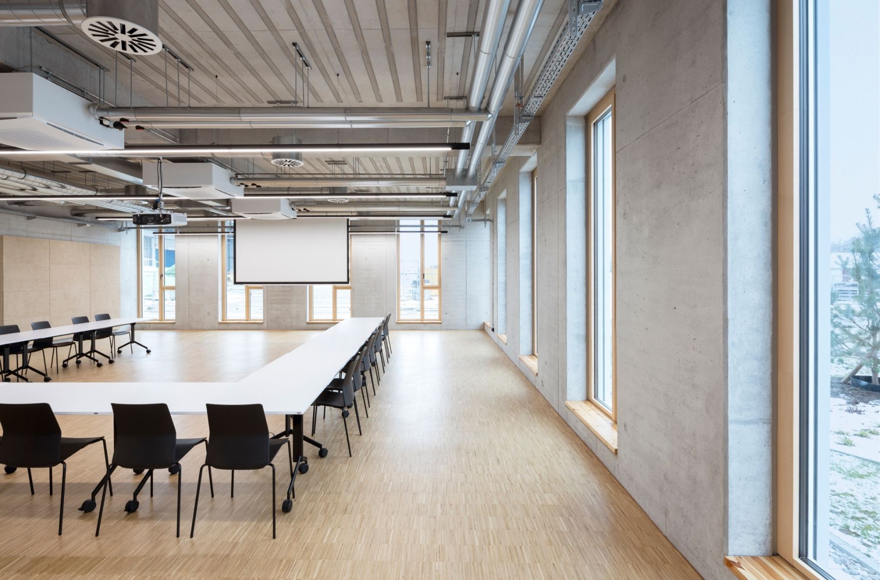 Im Erdgeschoss sorgt Stahlbeton für Robustheit bei hohen Lasten. Die drei oberen Geschosse sind als Holzbau konzipiert. Ergänzt wird das Ensemble durch ein Produktions- und Logistikgebäude in reiner Holzkonstruktion.