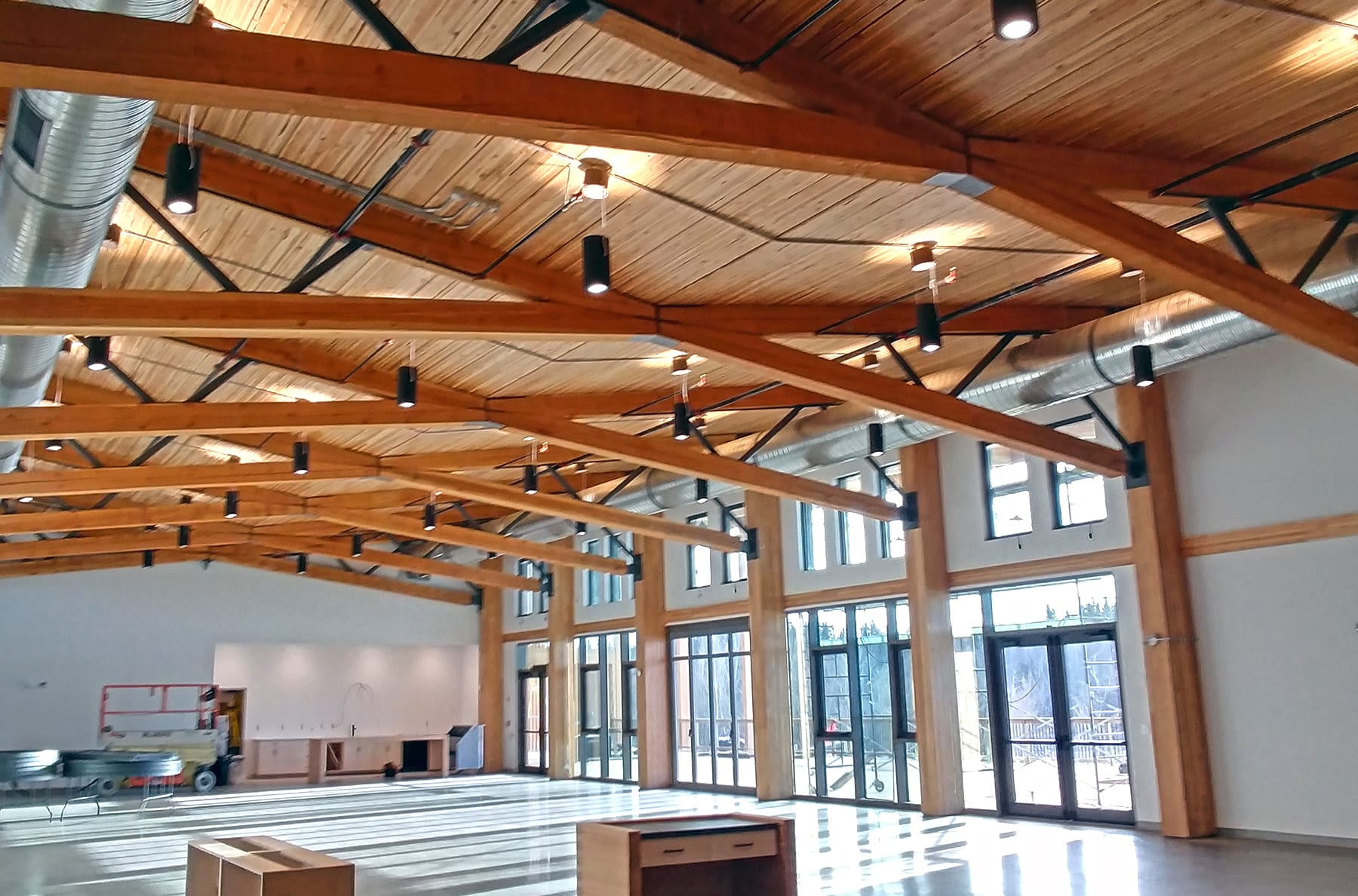 The structure incorporates the use of many different wood materials, including glue-laminated roof panels, beams, and columns. The main roof is supported by innovative wood and steel trusses – each comprising 10” x 12” solid timber chords and steel web members, combining to span approximately 47 feet. The roof geometry and structure are designed to mimic the infinity symbol, which represents Métis culture living forever, and the unity between First Nations and European cultures.