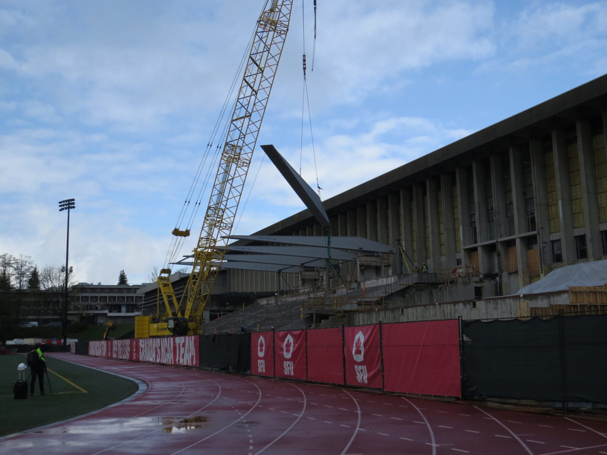 A major construction milestone for the new Simon Fraser University’s (SFU) Grandstand was reached last week when the final cantilever steel girder was lifted into place. The steel girders will provide support to a CLT “floating” canopy roof cantilevering 16m to provide weather protection and unobstructed views for the spectators below.