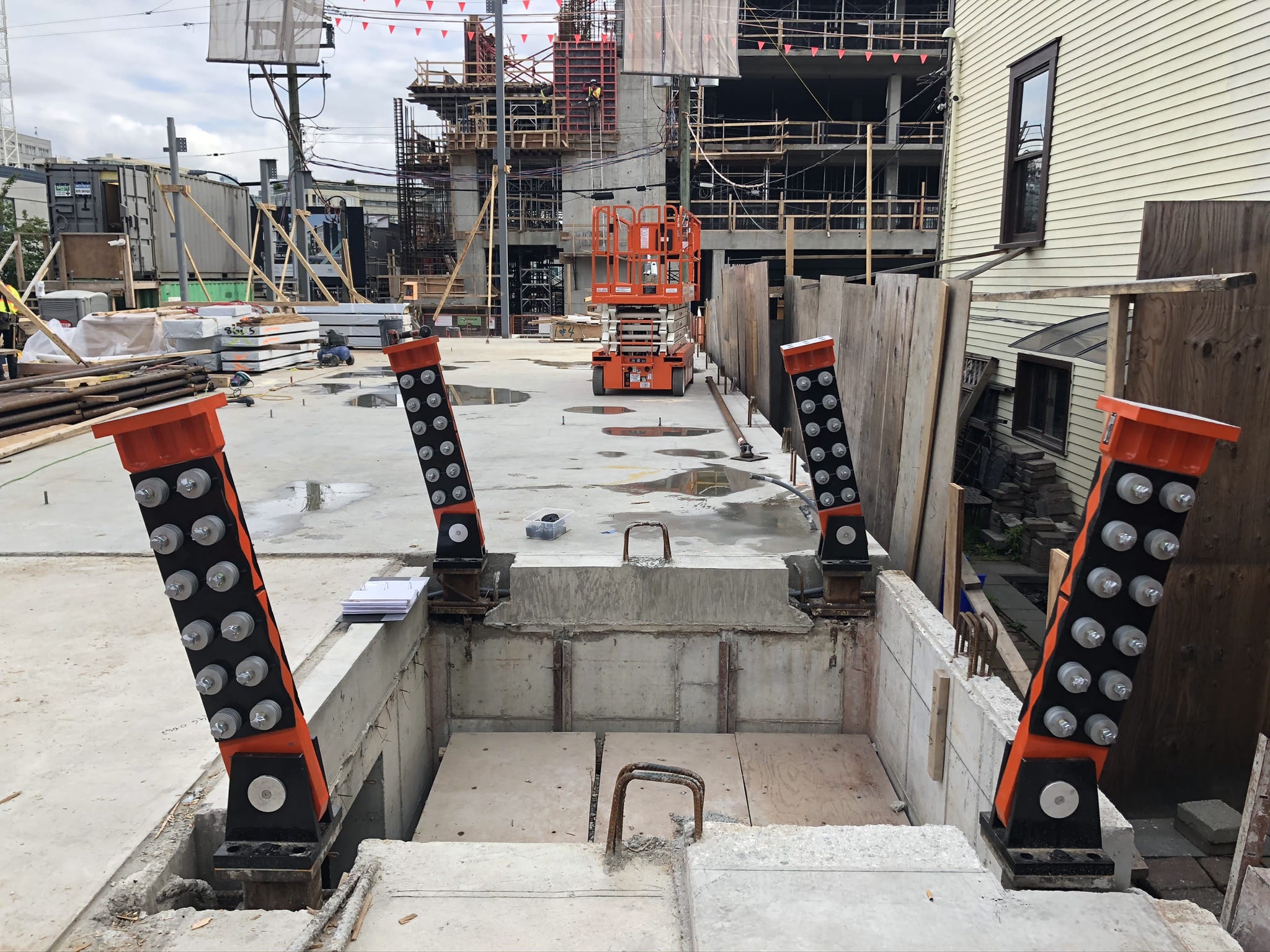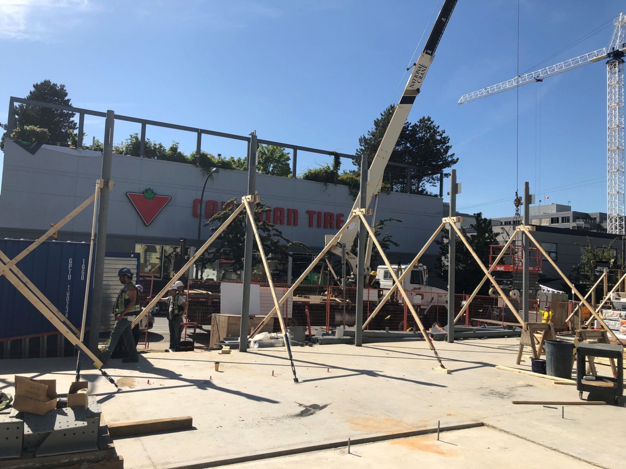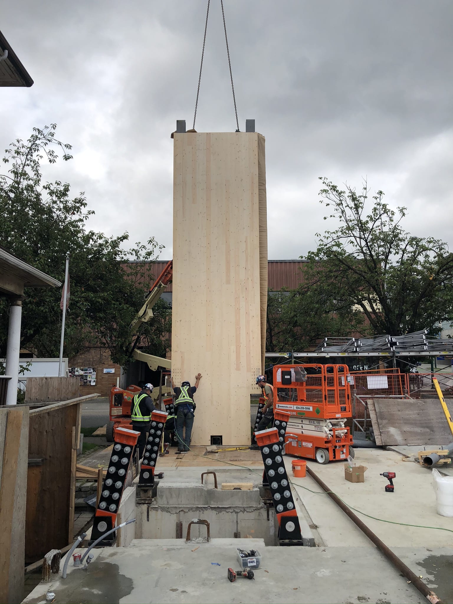Erection of the new office superstructure is underway! The first floor steelwork is installed and cross-laminated timber (CLT) panels are being flown into place at the property line and within the stair shafts. At this time, the superstructure is anticipated to be erected within a matter of weeks. Off-site vibration testing for the 3-ply CLT floor panels has also been completed.