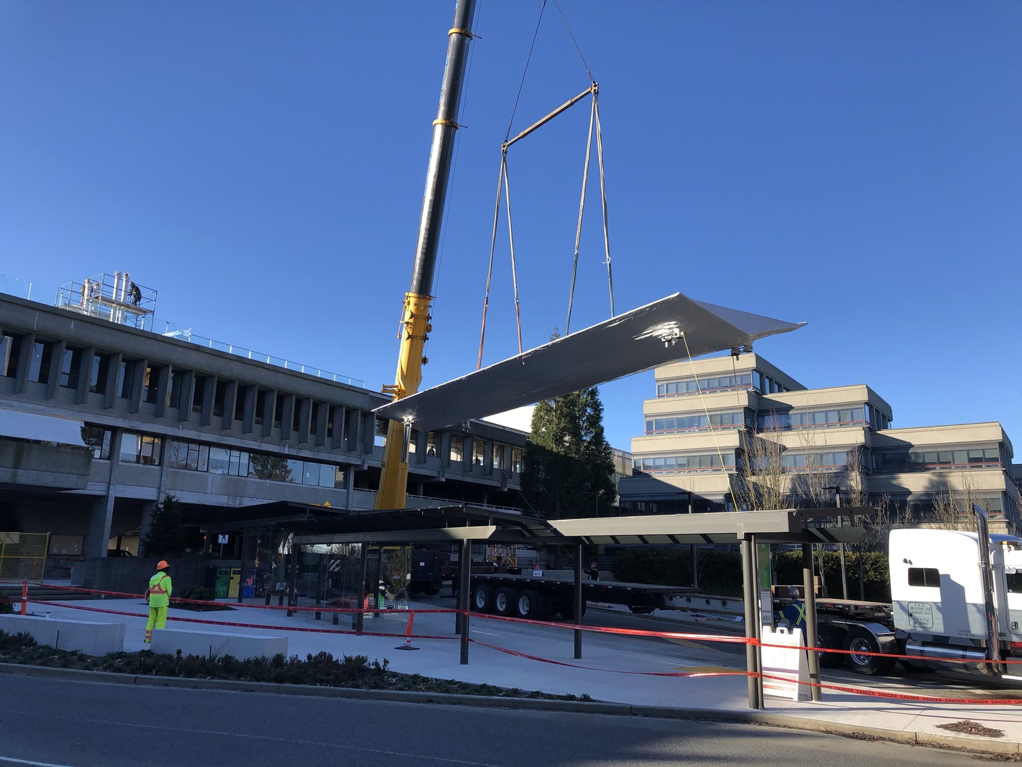 Crews craned in a new roof as part of the SFU Plaza Renewal Project – a multi-phase extensive renovation and refreshment of the Academic Quadrangle and Convocation Mall areas of the SFU Burnaby Campus, originally built by Arthur Erikson in the 1960’s. The plaza serves a double function as a public space and as a roof sheltering education spaces beneath.