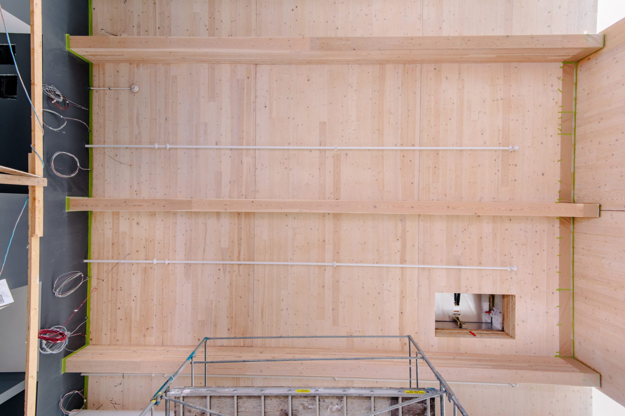 Many building elements were prefabricated to facilitate quick installation: The Tectonus elements were embedded in the CLT shear walls, moisture barriers and insulation were preinstalled on all CLT exterior walls, and service penetrations through glulam beams were CNC-cut in the shop. Additionally, a 3D clash detection model, including all structural and glazing components, was built in Rhino3D to reduce potential site conflicts and facilitate the high level of prefabrication.