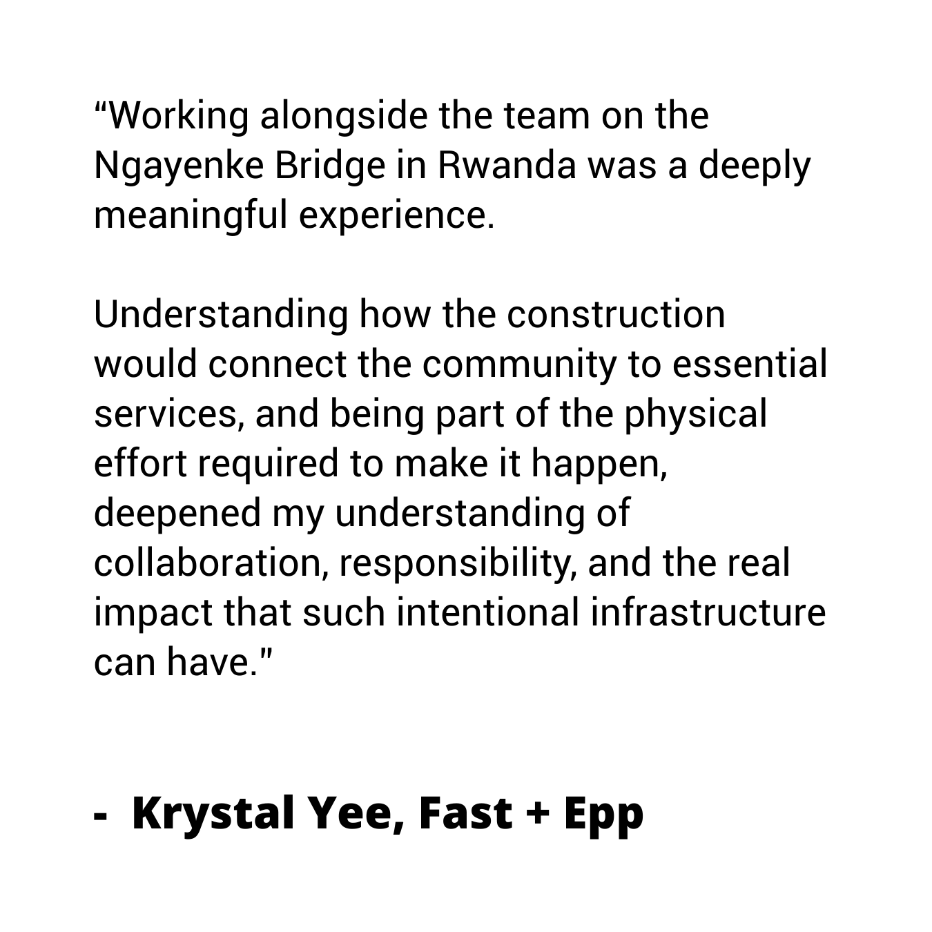 The completion of this bridge marks a meaningful outcome for both the community and the team. It provides safe, year-round access to essential services, while the build highlighted the value of teamwork and working closely with local community members. Fast + Epp is grateful to have collaborated with Fika and to have played a part in this important project. The opportunity to support such a significant initiative for the community is something Fast + Epp will remember for years to come.